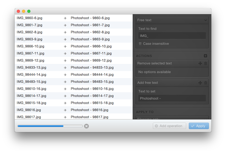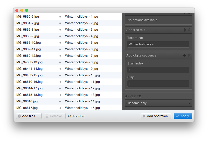 View available selection modesRenaming process will not give you enough time to get a coffee. Click on the Apply button, select your destination folder (on most cases, the same as your source files) and let the magic happen !